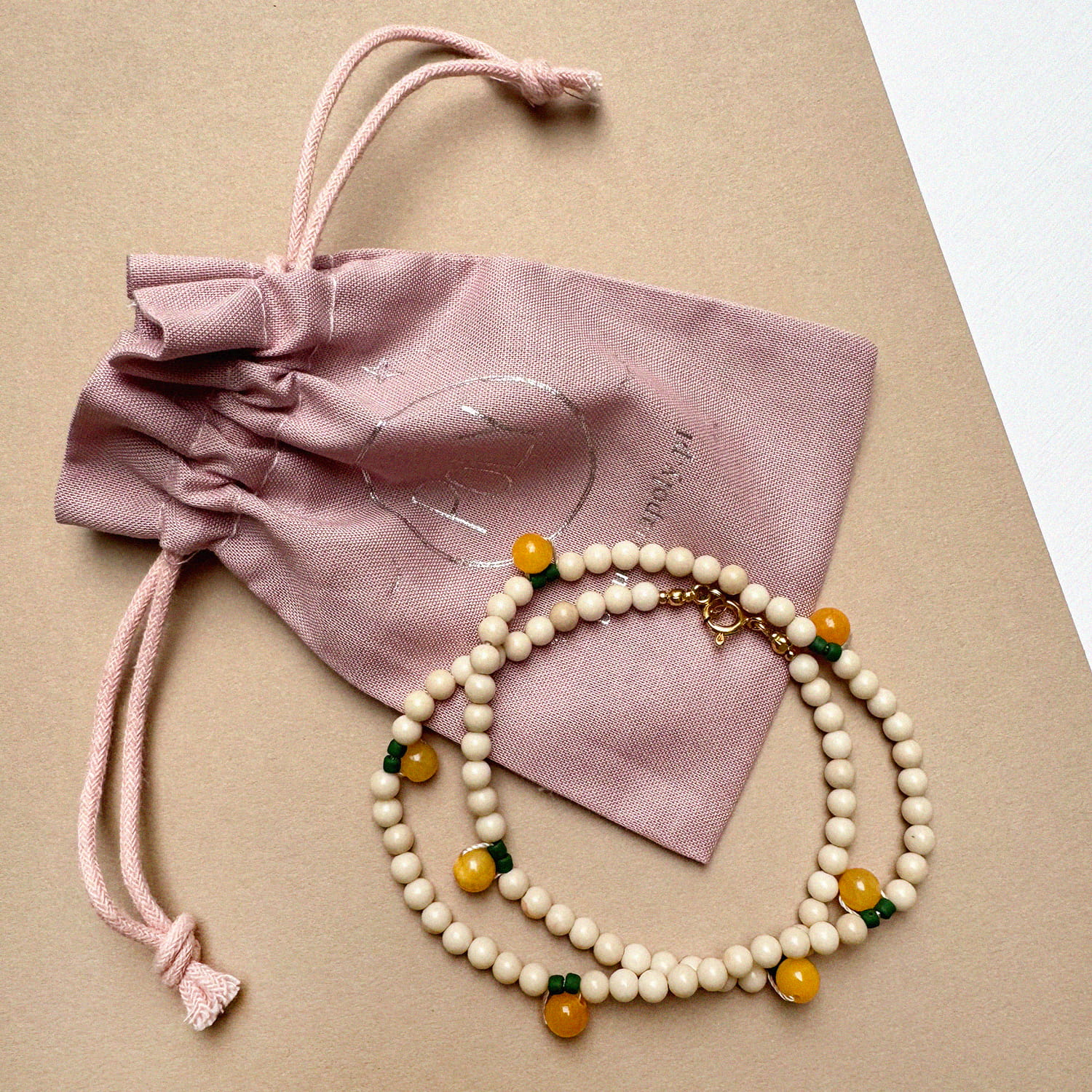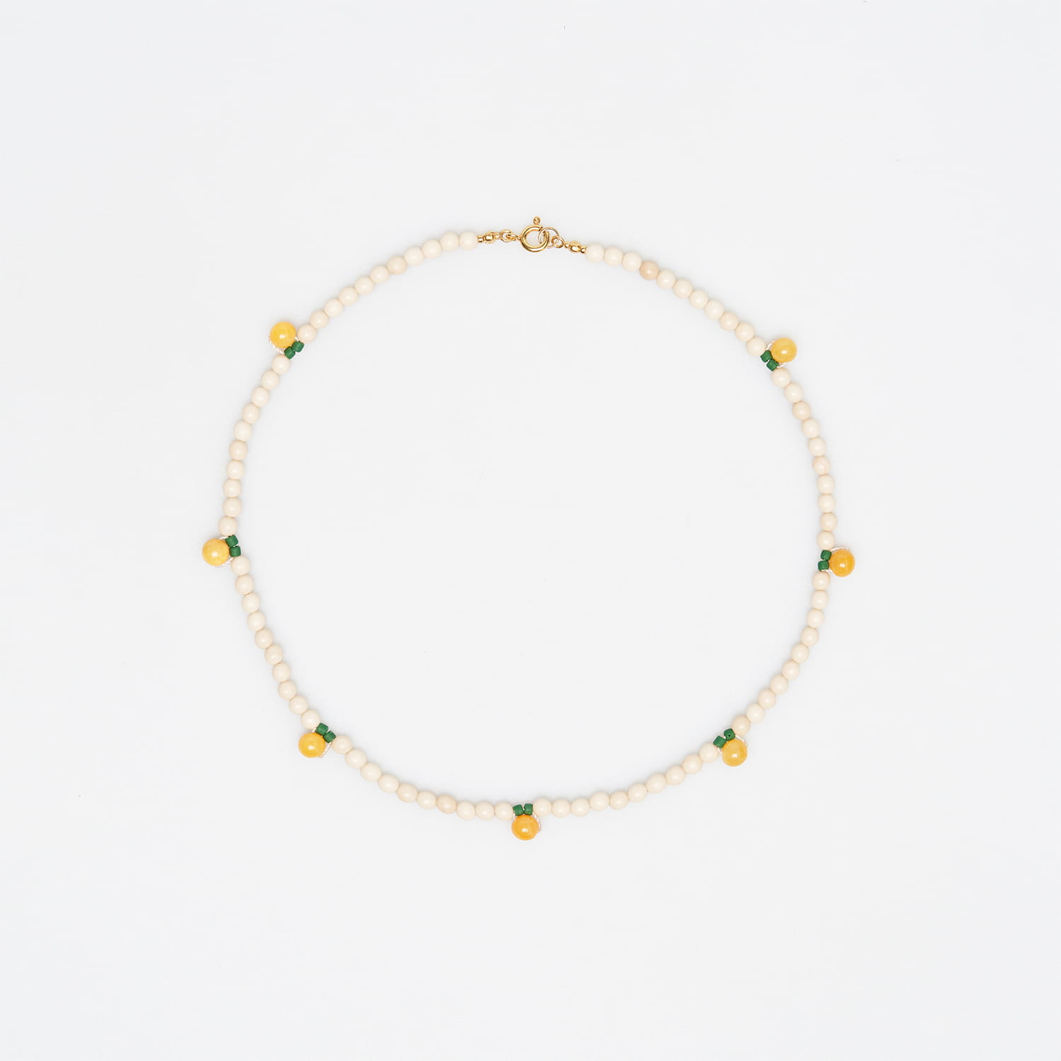 MATERIAŁ: kamień rzeczny, jadeit, srebro pozłacane 24 karatowym złotem. KOLORY: ecru, żółty, zielony, złoty. ROZMIAR: długość ok. 41 cm. + zapięcie