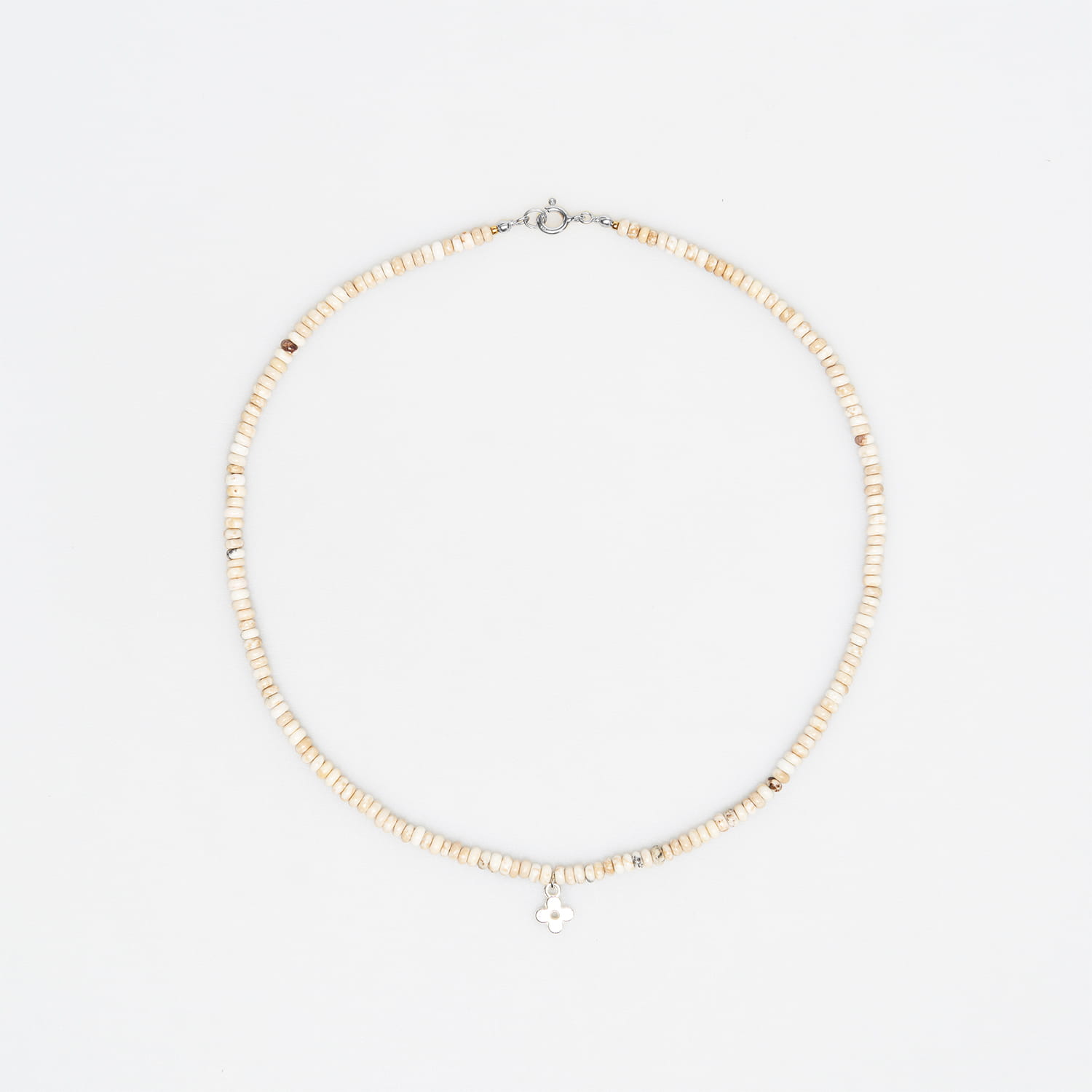 Naszyjnik z kamieni naturalnych i z zawieszką w kształcie kwiatka.