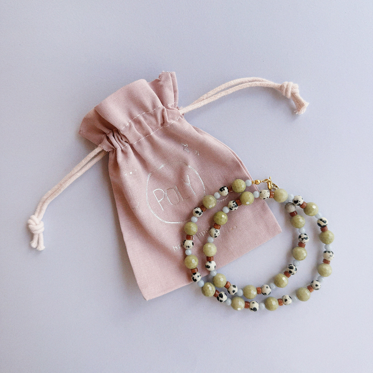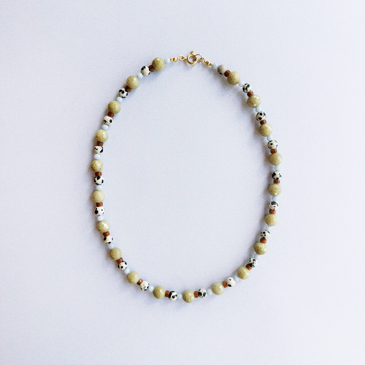 MATERIAŁ: jaspis matcha, jaspis dalmatyński, jaspis czerwony, angelit, srebro pozłacane 24 karatowym złotem.