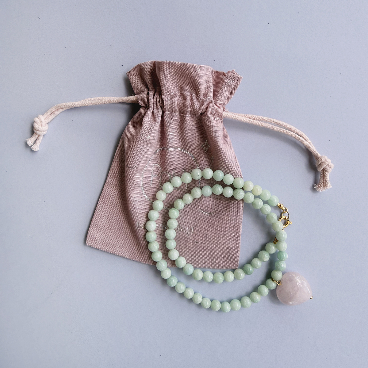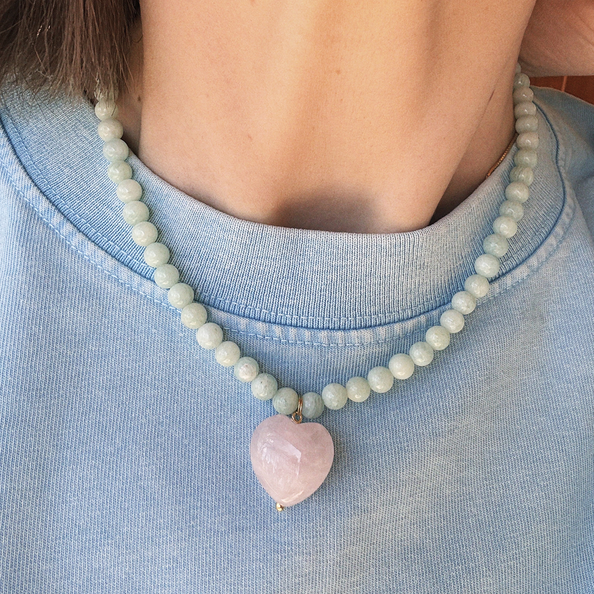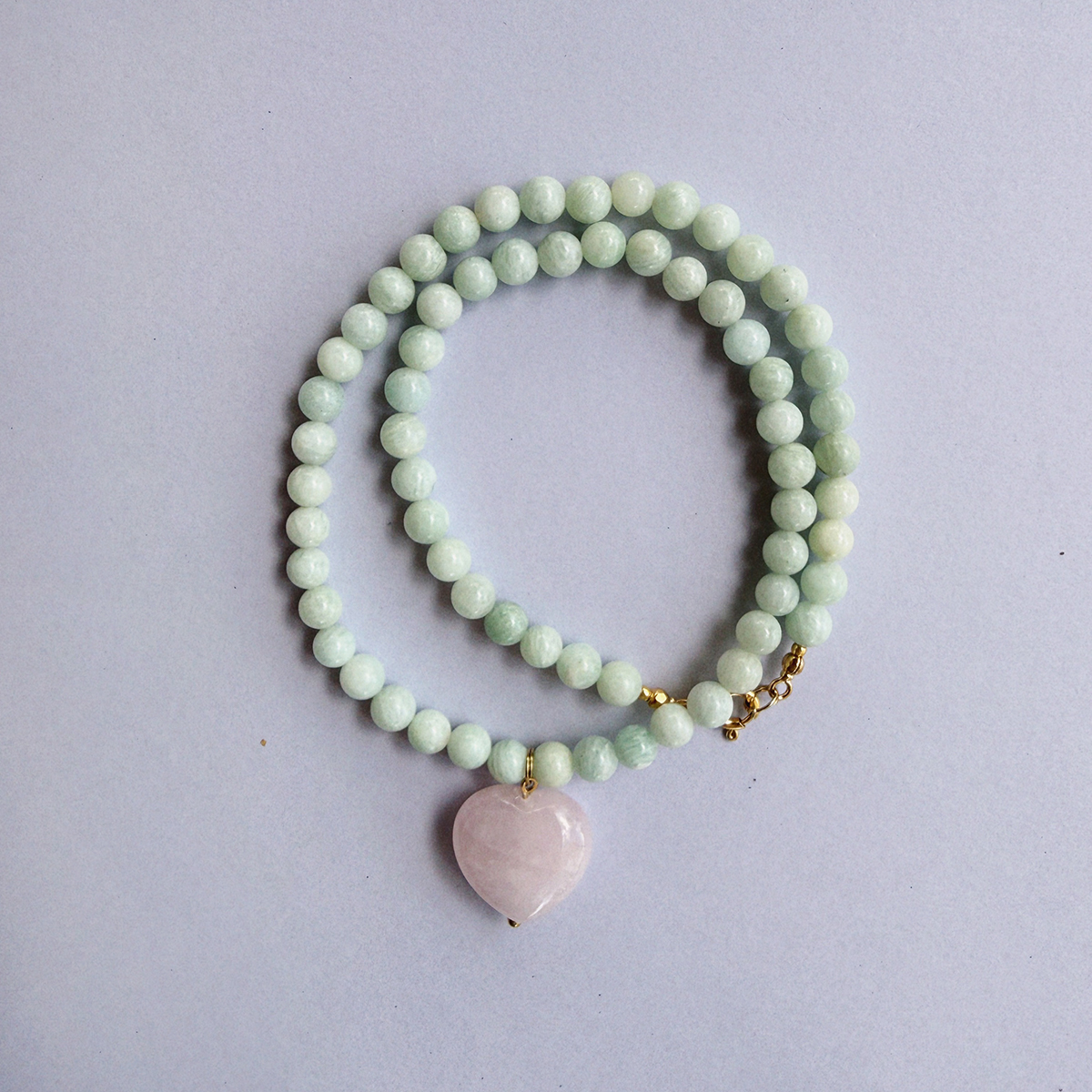 MATERIAŁ: amazonit, kwarc różowy, srebro pozłacane 24 karatowym złotem. KOLORY: zielony, różowy, złoty. ROZMIAR: długość naszyjnika ok. 41 cm. plus zapięcie.